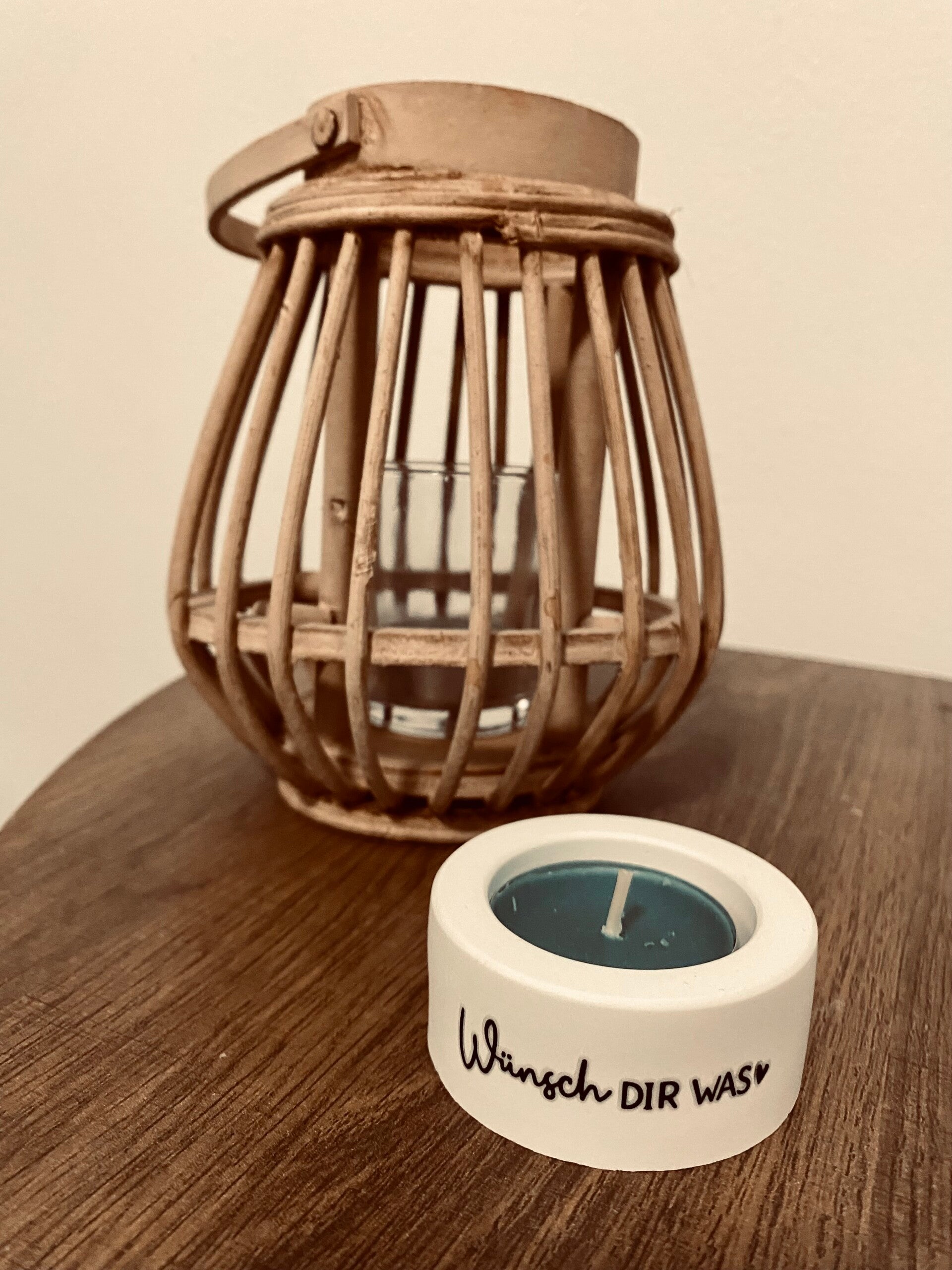 Stilvoller Teelichthalter mit Aufschrift (am Beispiel "Wünsch dir was"). Ein kleines Highlight für gemütliche Abende oder als Geschenk.