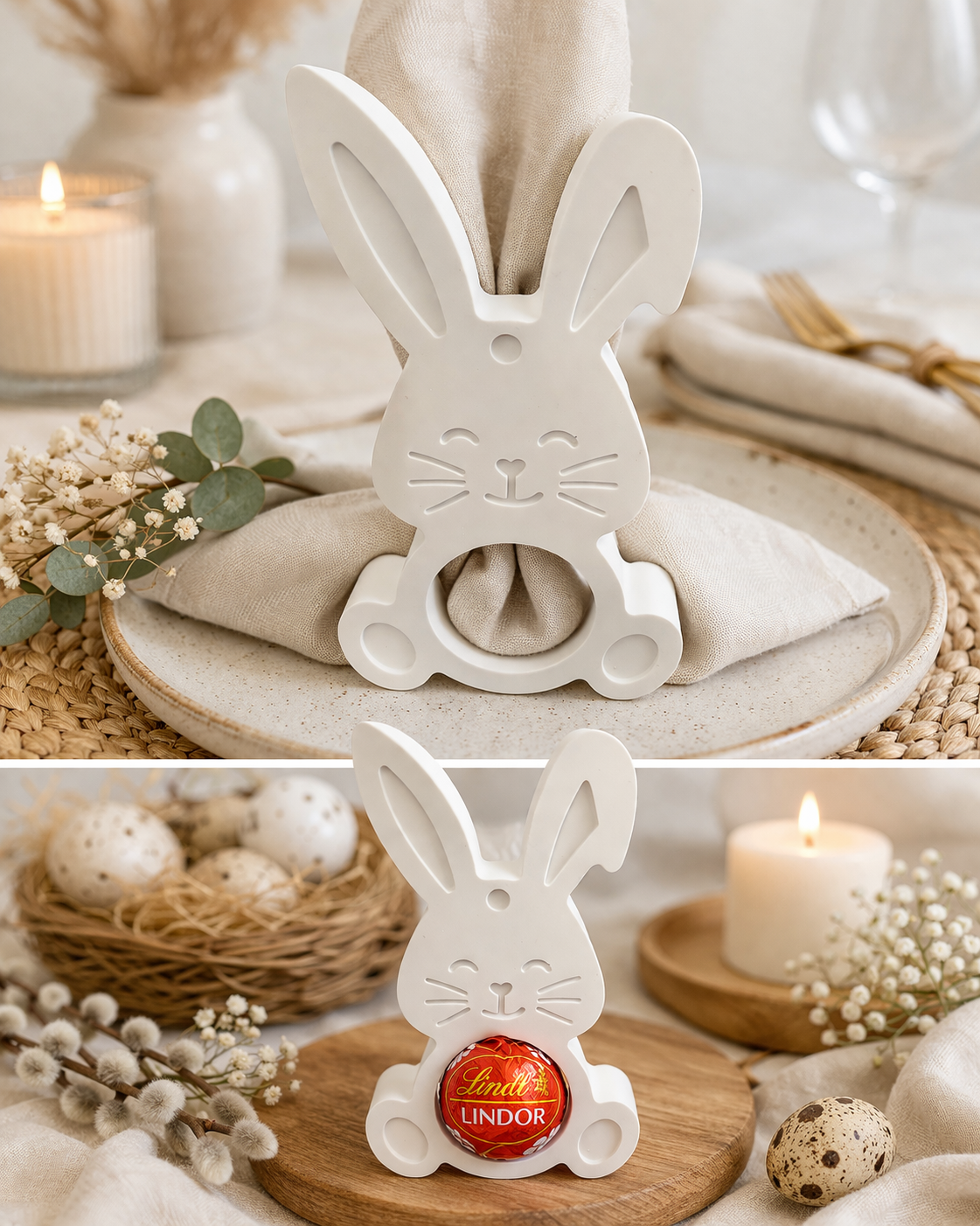 Dieser liebevoll gestaltete Serviettenring in Hasenform sorgt sofort für eine warme, frühlingshafte Atmosphäre auf Ihrem gedeckten Tisch. Ob mit Stoffserviette oder einer kleinen Schokoladenkugel dekoriert – der süße Hase ist ein echter Hingucker und ideal für Osterbrunch, Familienfeiern oder als kleines Gastgeschenk.